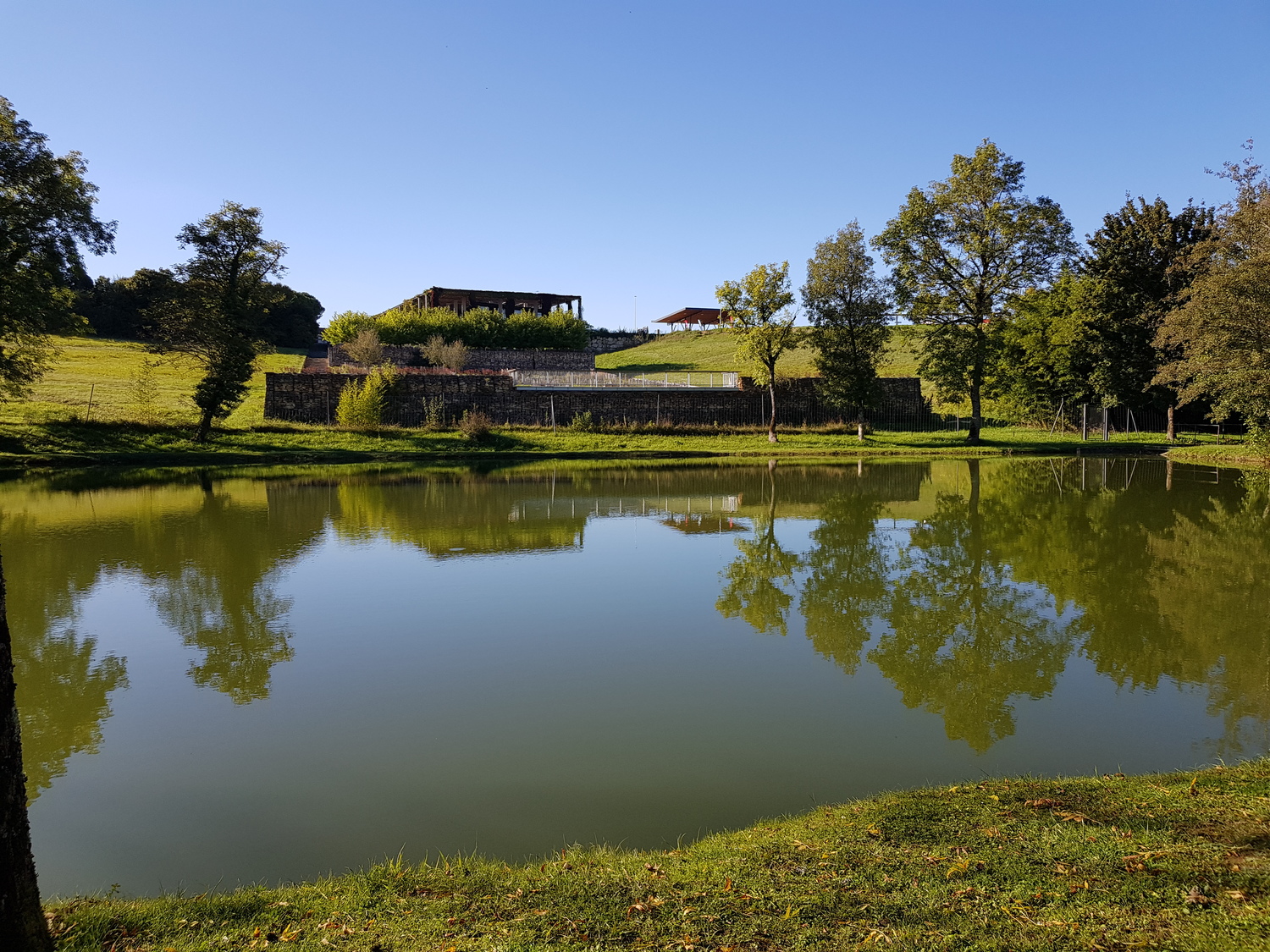 From there, through rolling countryside dotted with ponds to the community hostel with its quaint