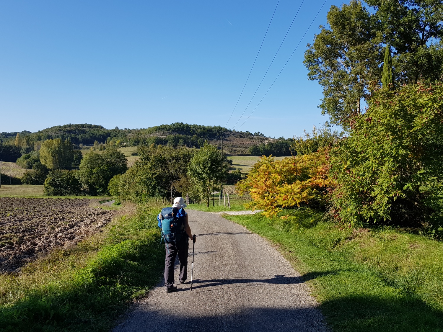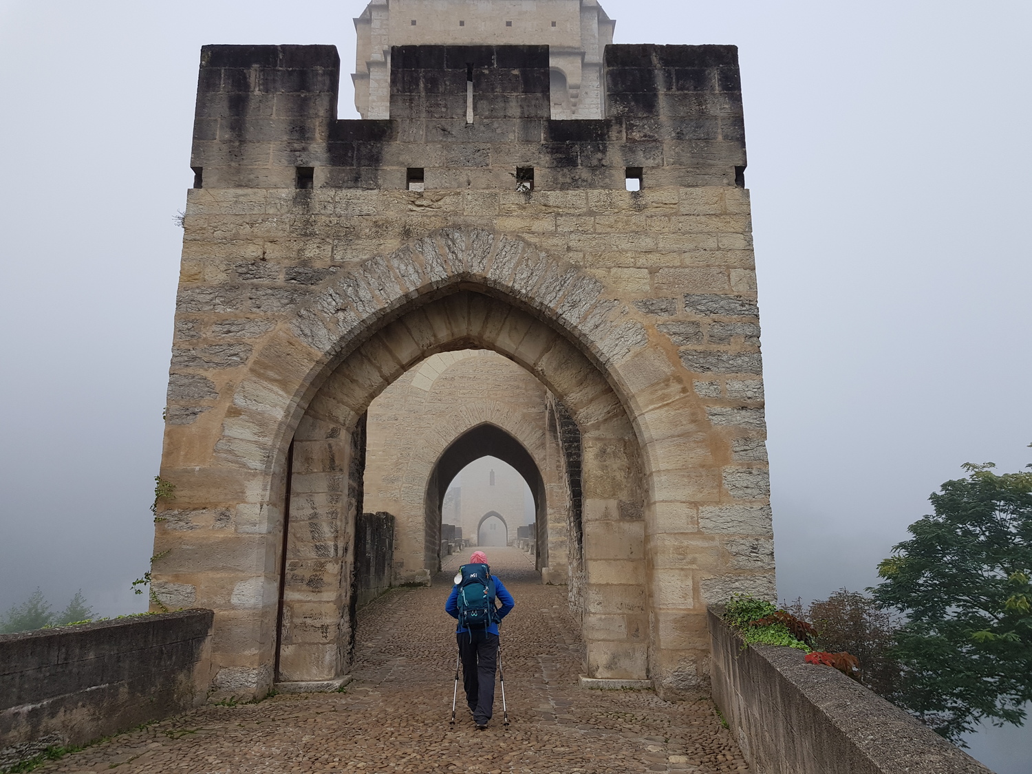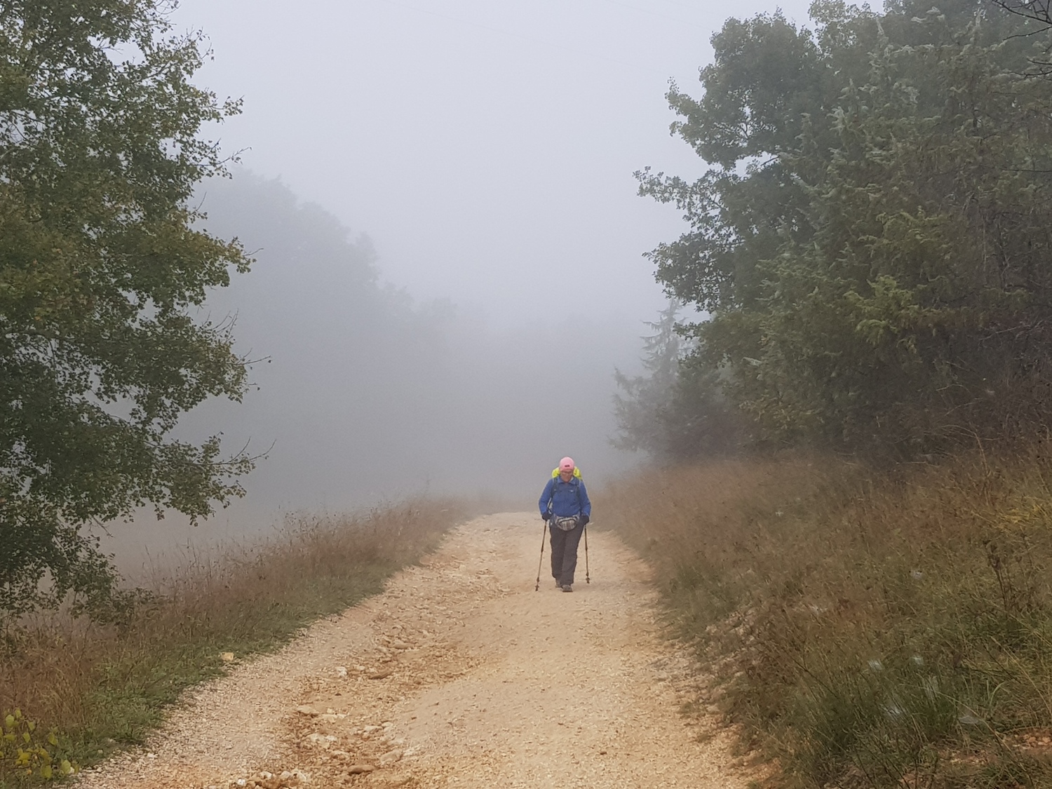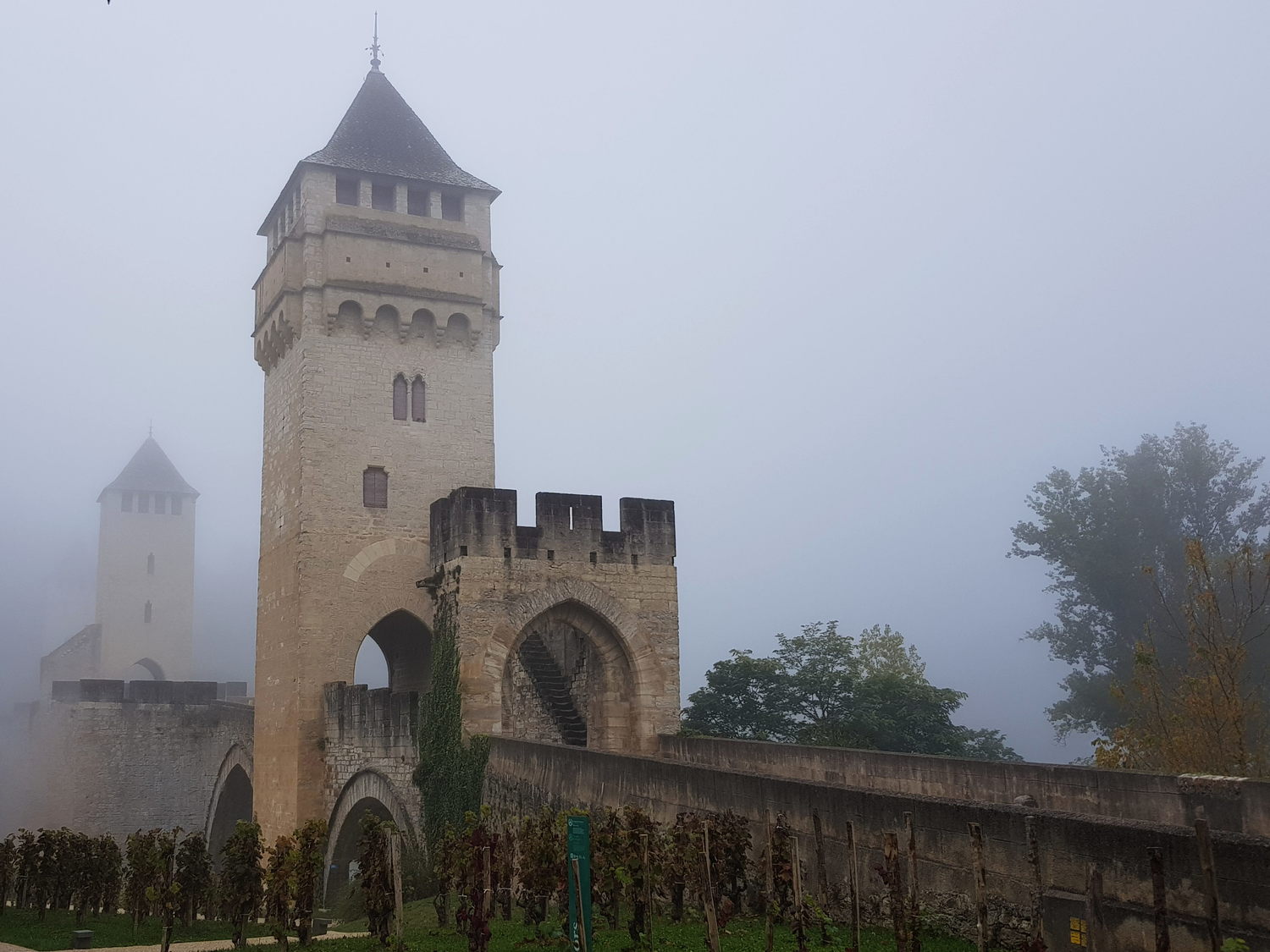 We set off in the fog across the famous 14th century Valentré Bridge and climbed up the steep hillside on the direct route,