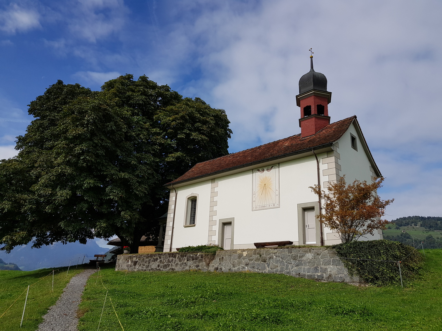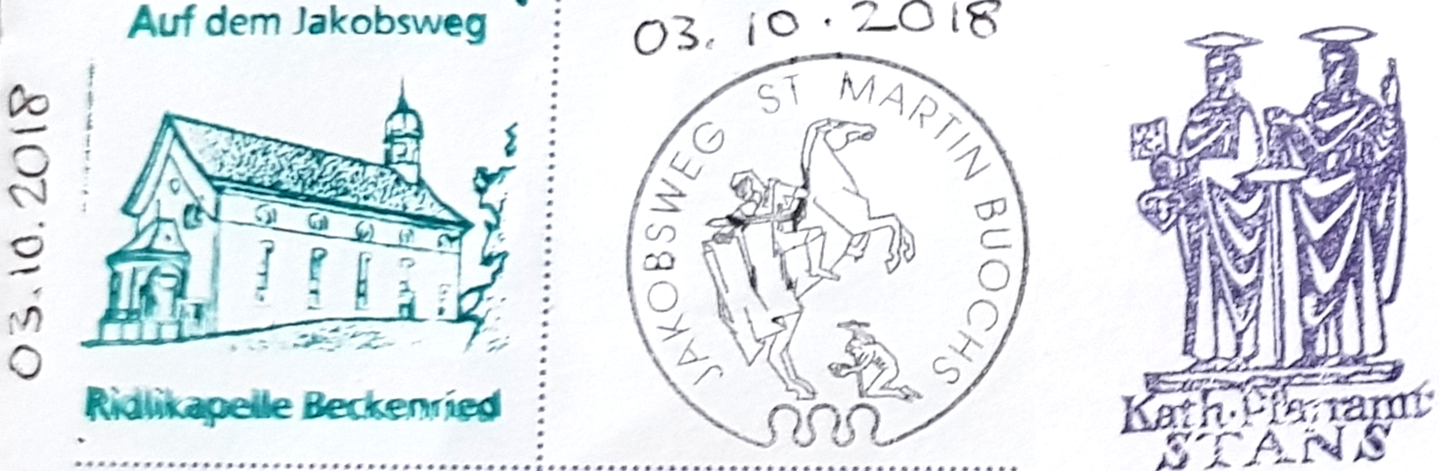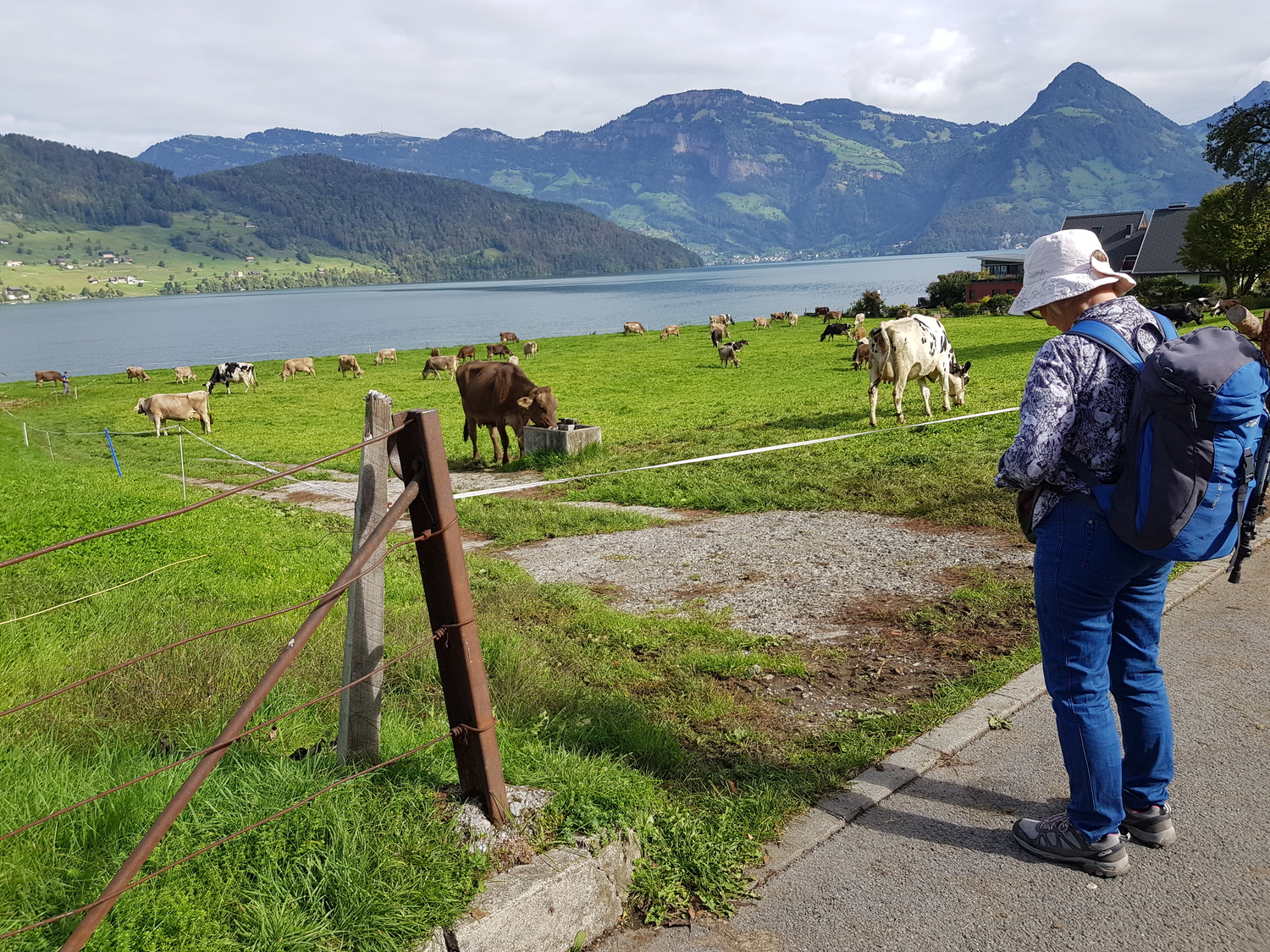 Due to the mountains and lakes, our journey time was getting longer at this point. Today was most walking on roads next to traffic, which Sue in particular found to be very tiring and was exhausted, although this could also have been due to a lack of sleep, food or water. It was partly cloudy but the sun did come out, making it difficult to know what to wear as the temperature was constantly changing. Stans, the capital of Nidwalden, was a big surprise as it had an interesting ‘old’ town, including a 15th century ossuary. We picnicked at a place that had a bench and a toilet for our use. We saw very few people on our way it being built up areas. We drove to the apartment for supper, after which Sue felt a lot better. Then, Angus drove Sue to Fischingen for Compline and meditation. It was a beautiful meditation session in the main church in front of the High Altar and around a massive font filled with water.