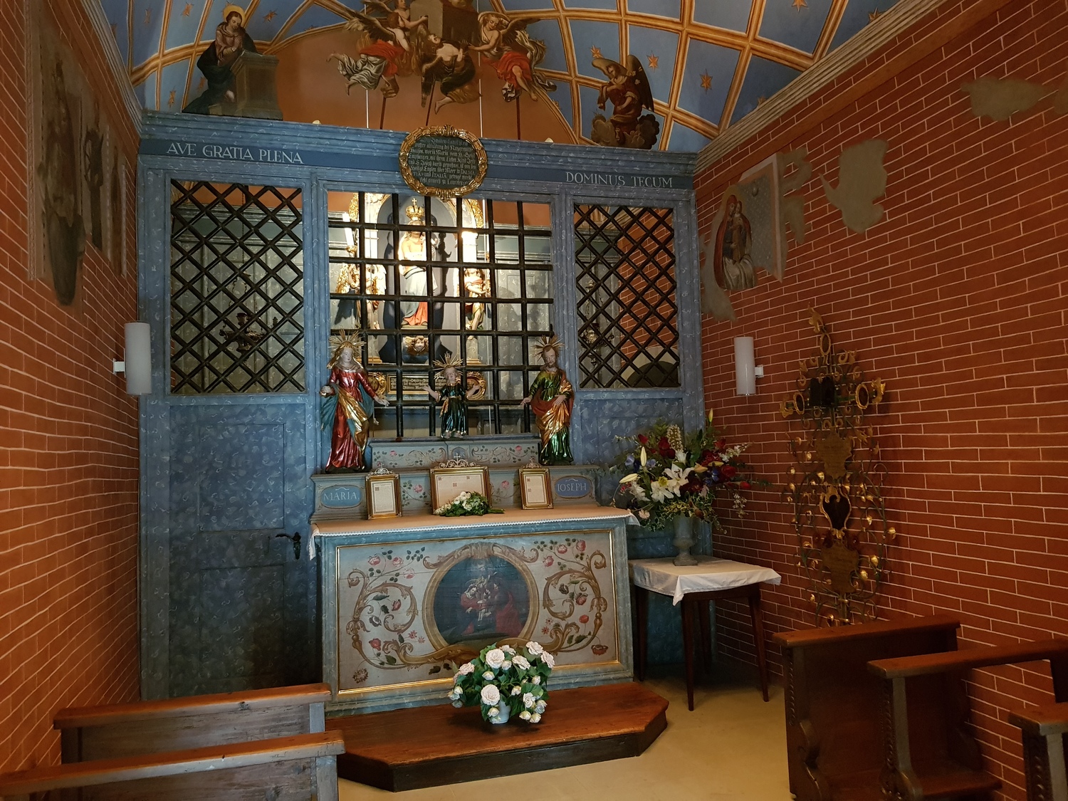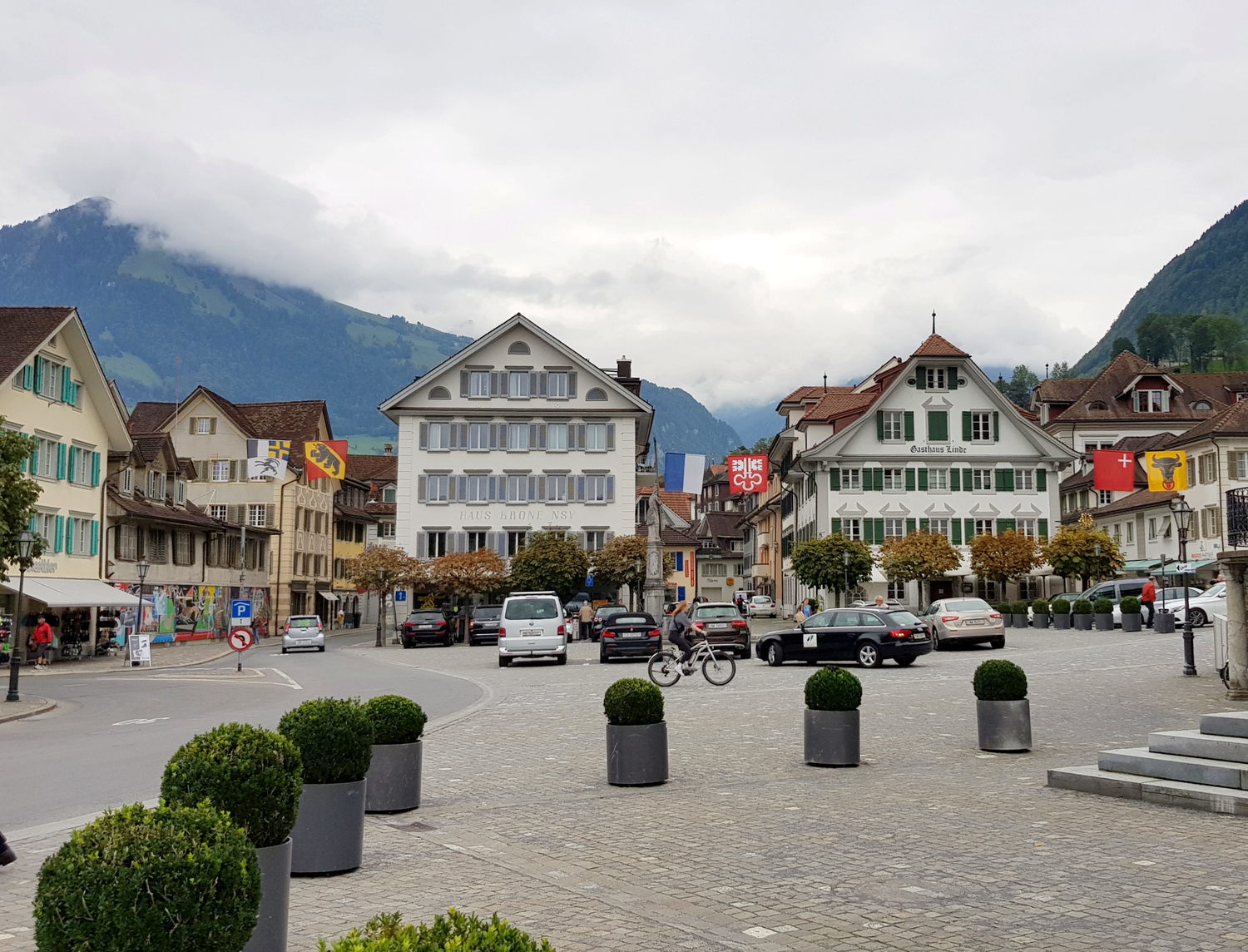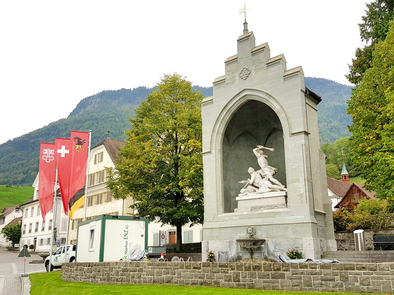 Due to the mountains and lakes, our journey time was getting longer at this point. Today was most walking on roads next to traffic, which Sue in particular found to be very tiring and was exhausted, although this could also have been due to a lack of sleep, food or water. It was partly cloudy but the sun did come out, making it difficult to know what to wear as the temperature was constantly changing. Stans, the capital of Nidwalden, was a big surprise as it had an interesting ‘old’ town, including a 15th century ossuary. We picnicked at a place that had a bench and a toilet for our use. We saw very few people on our way it being built up areas. We drove to the apartment for supper, after which Sue felt a lot better. Then, Angus drove Sue to Fischingen for Compline and meditation. It was a beautiful meditation session in the main church in front of the High Altar and around a massive font filled with water.