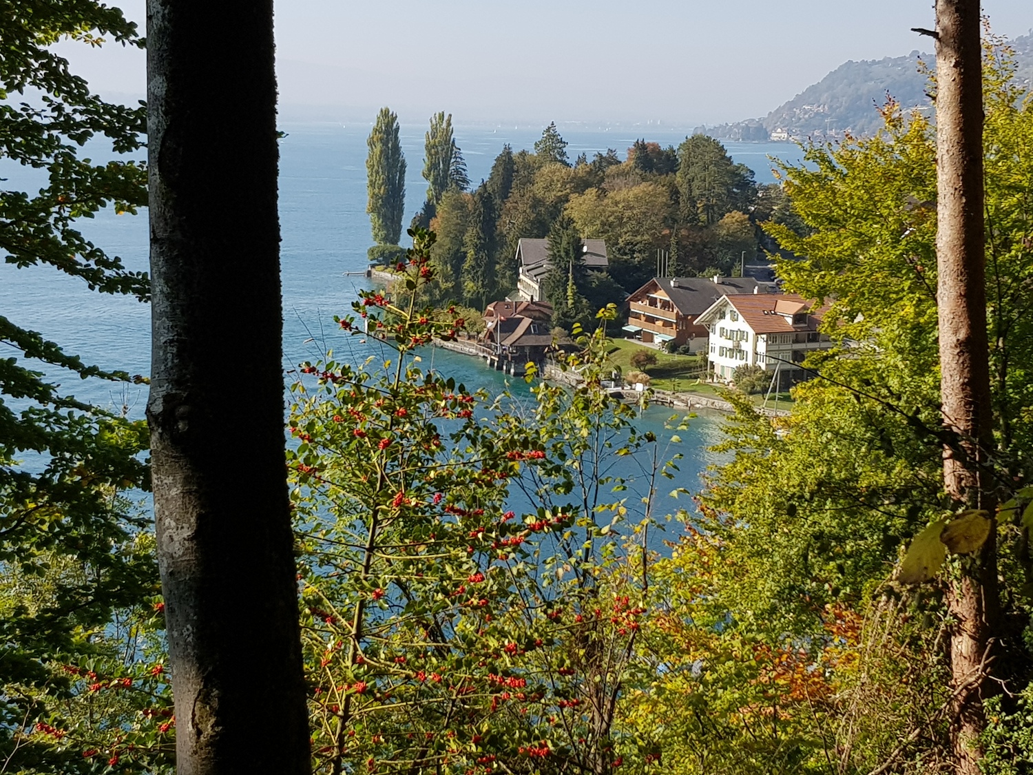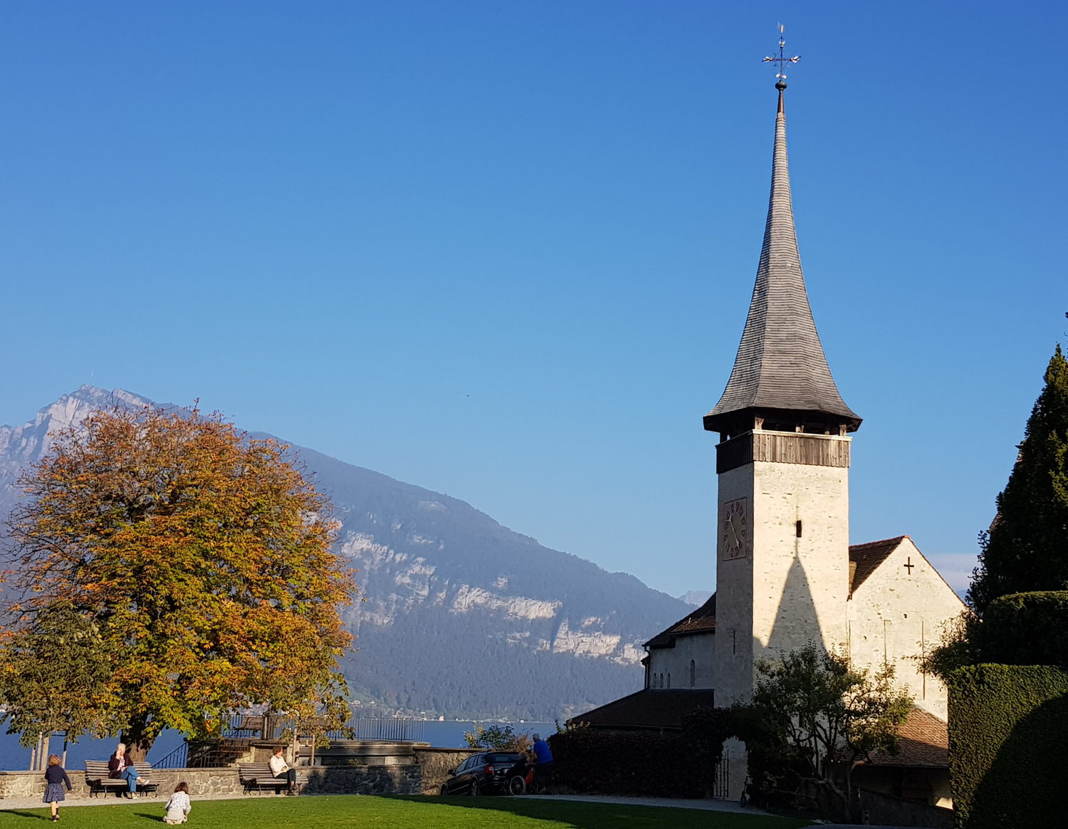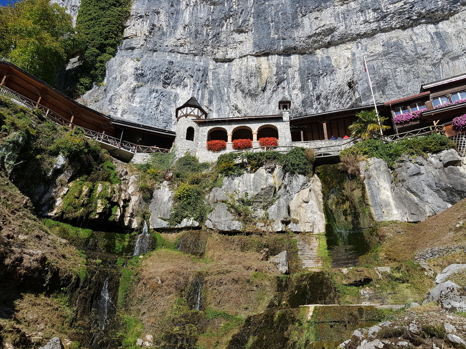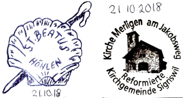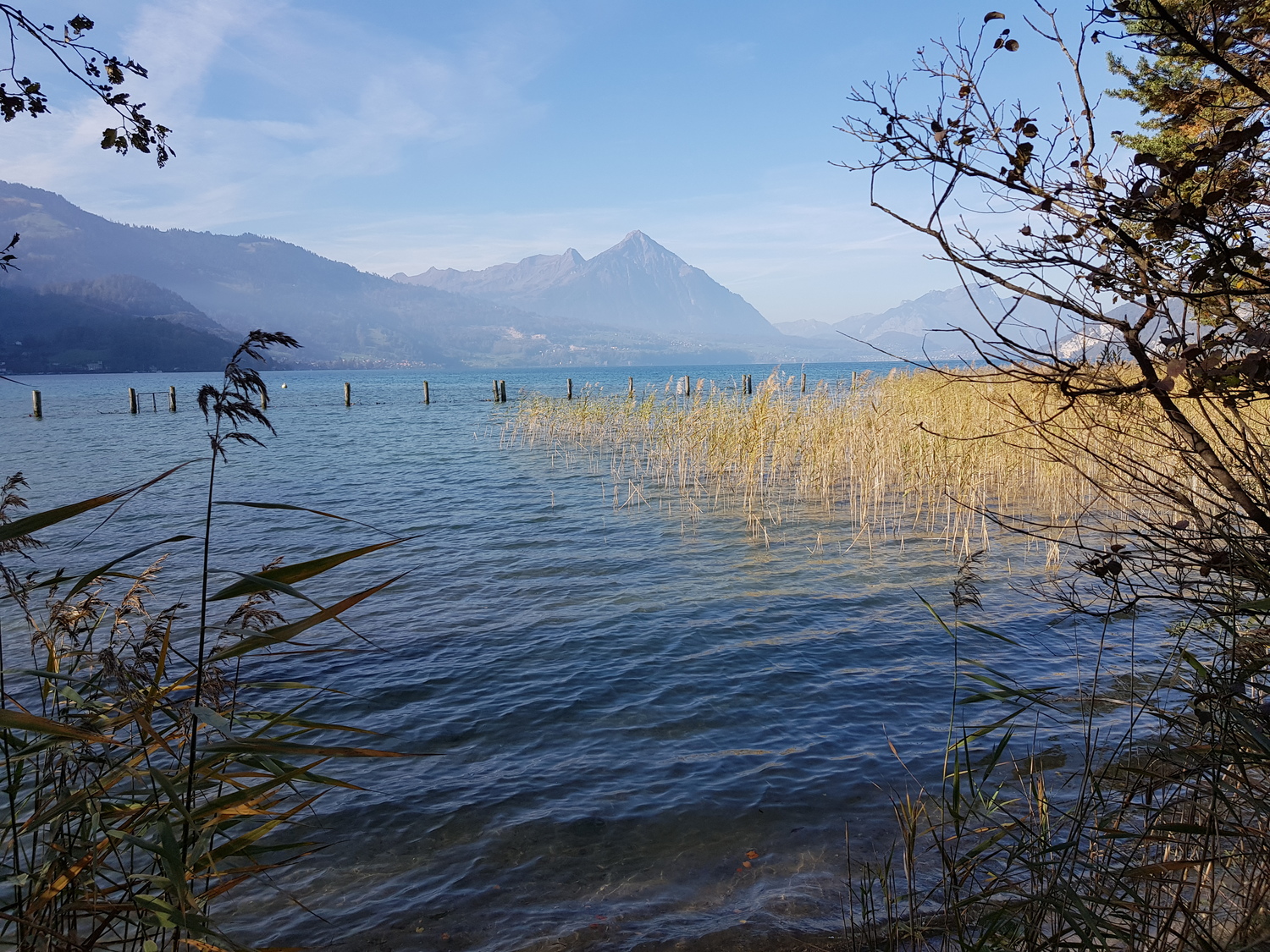 Today we took the train and walked from Interlaken. We walked along the canal and then the lake and it was a lovely walk. Being Sunday, we saw more people than usual. The day started foggy but then cleared to a beautiful blue sky. We passed many dried up streams, and went to Beatus Höhle to look around and get a stamp. After that the path seemed to be very old as the sides were boarded with stones - a very pleasant walk. At Merlingen we took the boat across to Spiez. It would seem that there was a route via Thun but that it has been suspended. From Spiez we took the train home. Now that we are not far from home that we will be able to continue walking to Geneva which, when we started, Sue was not thinking we would be able to manage. The ‘Way’ is now a lot easier.