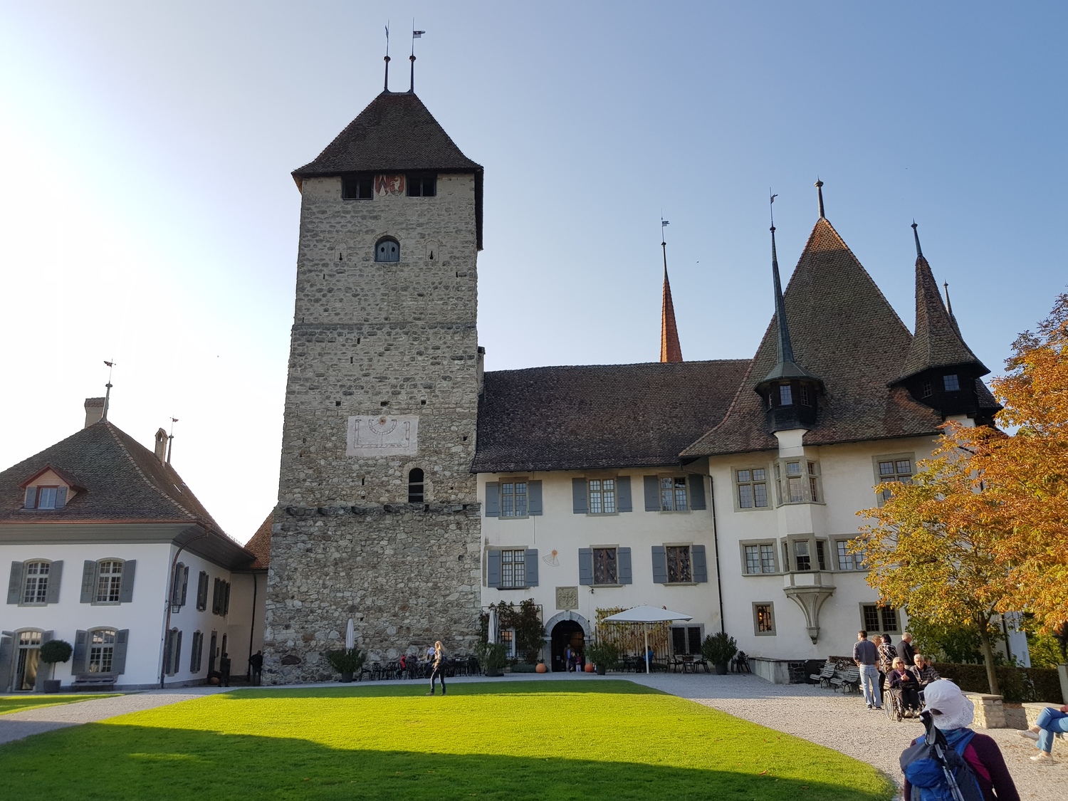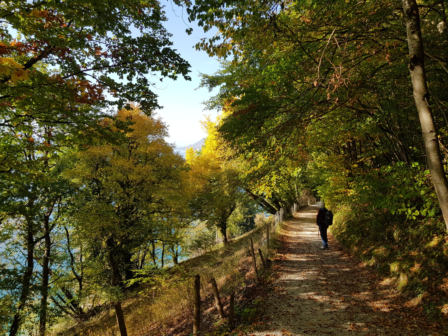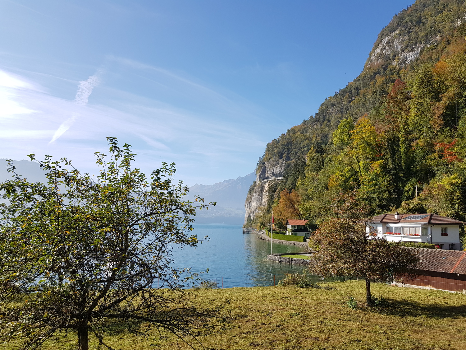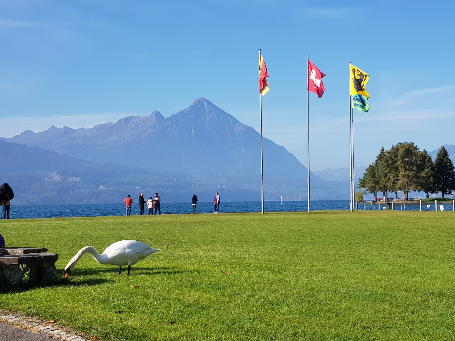 Today we took the train and walked from Interlaken. We walked along the canal and then the lake and it was a lovely walk. Being Sunday, we saw more people than usual. The day started foggy but then cleared to a beautiful blue sky. We passed many dried up streams, and went to Beatus Höhle to look around and get a stamp. After that the path seemed to be very old as the sides were boarded with stones - a very pleasant walk. At Merlingen we took the boat across to Spiez. It would seem that there was a route via Thun but that it has been suspended. From Spiez we took the train home. Now that we are not far from home that we will be able to continue walking to Geneva which, when we started, Sue was not thinking we would be able to manage. The ‘Way’ is now a lot easier.