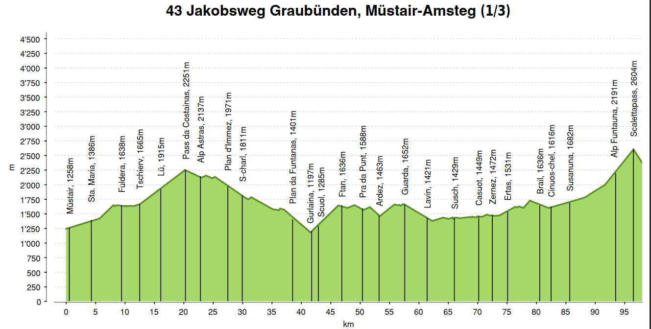 The Grisons Way, in Romansh the Via Son Giachen, takes pilgrims from the Val Müstair